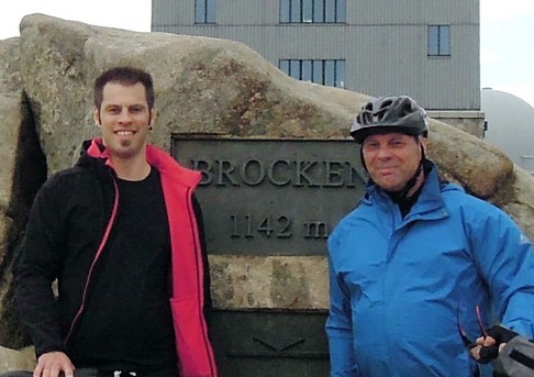 Am Ortsende angekommen, signalisiert uns eine Schranke und ein besetztes Kontrollhäuschen, dass hier die Grenze zum Naturschutzgebiet verläuft. Motorfahrzeuge sind auf diesem Streckenabschnitt nur zugelassen, wenn sie der Bewirtschaftung des Brockens dienen. Alle übrigen Gäste müssen ihren Weg mit dem Pferdewagen, zu Fuß oder mit dem Fahrrad fortsetzen. Die Brockenstraße schlängelt sich durch eine malerische Waldlandschaft. Die Steigungsneigung variiert im Laufe der Strecke. Nur wenige Serpentinen entzerren die Steigungsneigung. Die gesamte Wegstrecke zum Gipfel beträgt ca. 11 km, wobei im zweiten Abschnitt mehr Höhenmeter zu überwinden sind. Den Höhepunkt erreicht die Anfahrt auf den letzten 1.000 m, hier müssen die steilsten Passagen überwunden werden. Gleichzeitig strömen über angrenzende Fußwege Wanderer auf die Straße, die es geschickt zu umfahren gilt. Der Himmel ist während unserer Fahrt mit dunklen Regenwolken verhangen. Der dichte Nadelwald schützt uns auf der ganzen Fahrt vor dem heftigen Wind. Auf die uns begleitenden leichten Regenfälle hätten wir gern verzichtet, die kühle Temperatur hingegen ist bei der körperlichen Anstrengung sehr angenehm. Auf dem letzten Stück endet der Wald und der Gipfel kommt zum Vorschein. Während mein Bruder Benjamin noch mühelos die letzten paar hundert Meter erklimmt, fällt mir dieser Abschnitt recht schwer und das geringe Training macht sich bemerkbar. Große Streckenabschnitte fahren wir nur im ersten oder zweiten Gang. Wir sind überrascht, wie wenig Untersetzungsreserven unsere Räder bieten.
